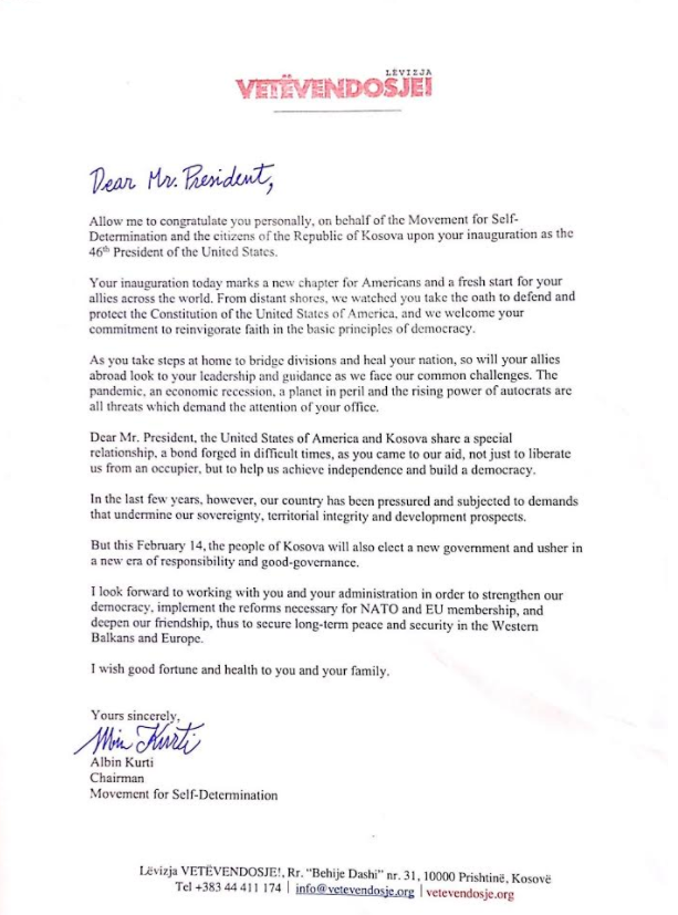 Kreu i Lëvizjes Vetëvendosje, Albin Kurti, njëherit kandidat për Kryeministër, e ka uruar demokratin Joe Biden me rastin e inaugurimit të tij si President i Shteteve të Bashkuara të Amerikës.