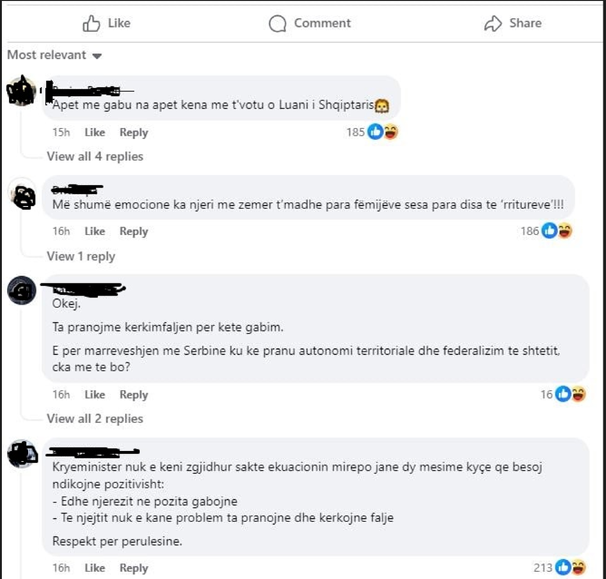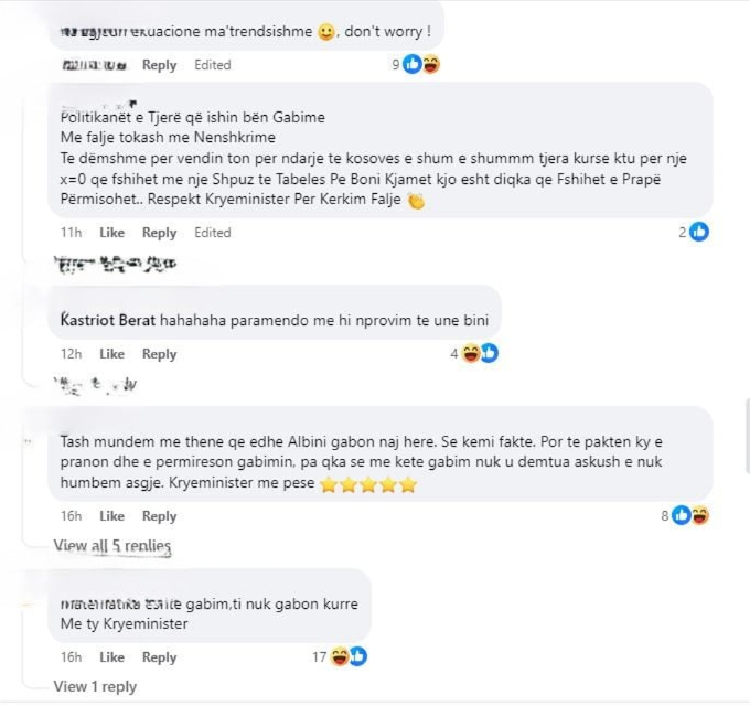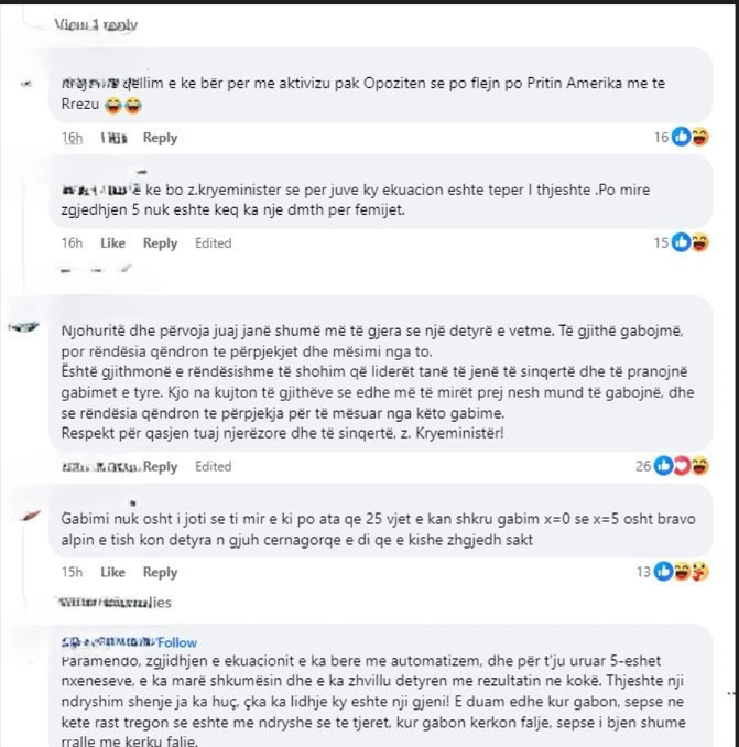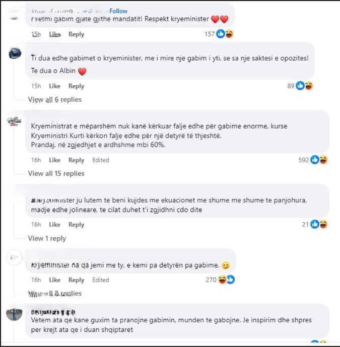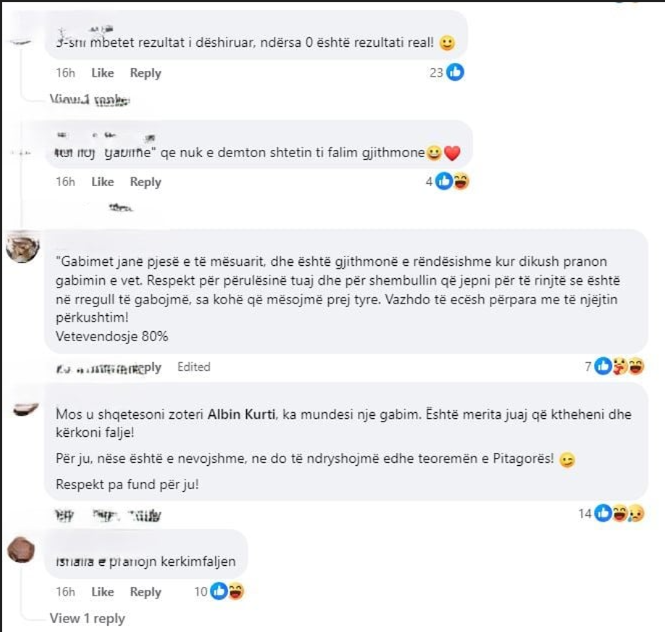“Kryeminister nuk e keni zgjidhur sakte ekuacionin mirepo jane dy mesime kyçe qe besoj ndikojne pozitivisht: Edhe njerezit ne pozita gabojne, Te njejtit nuk e kane problem ta pranojne dhe kerkojne falje. Respekt per perulesine”, “Nuk gabon kryeministri im, detyra ishte e gabuar , te paqim gjithmon o ma i madhi i vendit! 71% kysmet edhe majen e stambollit ki me fitu”, “I vetmi gabim gjate gjithe mandatit! Respekt kryeminister”, “Ti dua edhe gabimet o kryeminister, me i mire nje gabim i yti, se sa nje saktesi e opozites! Te dua o Albin”, ishin vetëm disa nga komentët e përkrahësve të zjarrtë të Kurtit.