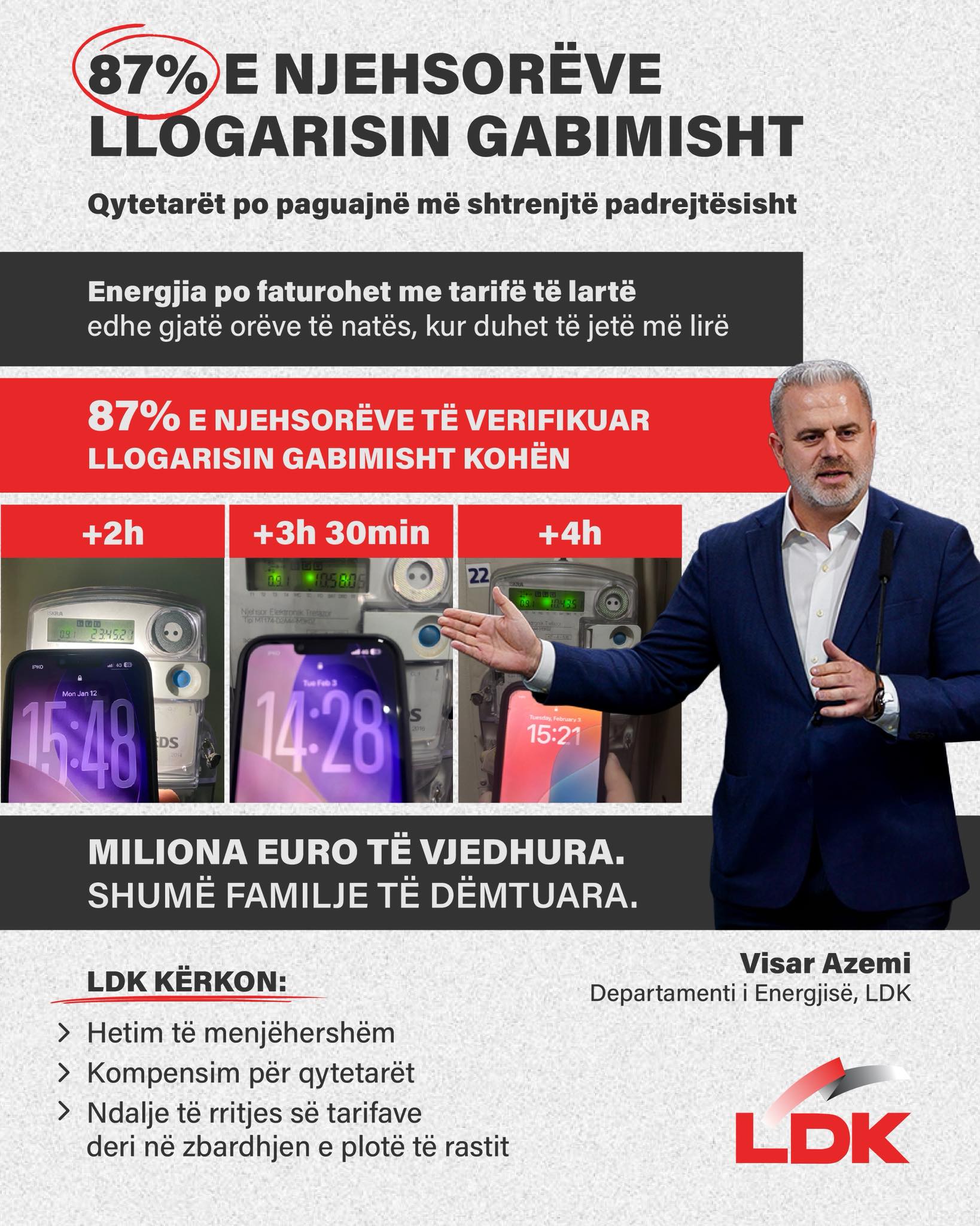 “Ajo që u prezantua dje në konferencë nga Departamenti ynë për Energji, përmes anëtarit tonë Visar Azemi, është alarmante. Qytetarët po paguajnë më shtrenjtë jo sepse konsumojnë më shumë, por sepse sistemi i matjes po keqllogaritë. Nga verifikimi i 884 njehsorëve që aktivistët tanë kanë bërë, 87% rezultojnë të llogarisin kohën gabimisht, duke faturuar energjinë me tarifë të shtrenjtë edhe gjatë orëve të natës. Kjo nuk është më rastësi. Është dështim sistemik”, ka shkruar ai, duke thënë se LDK-ja kësaj çështje do t`i shkojë deri në fund.