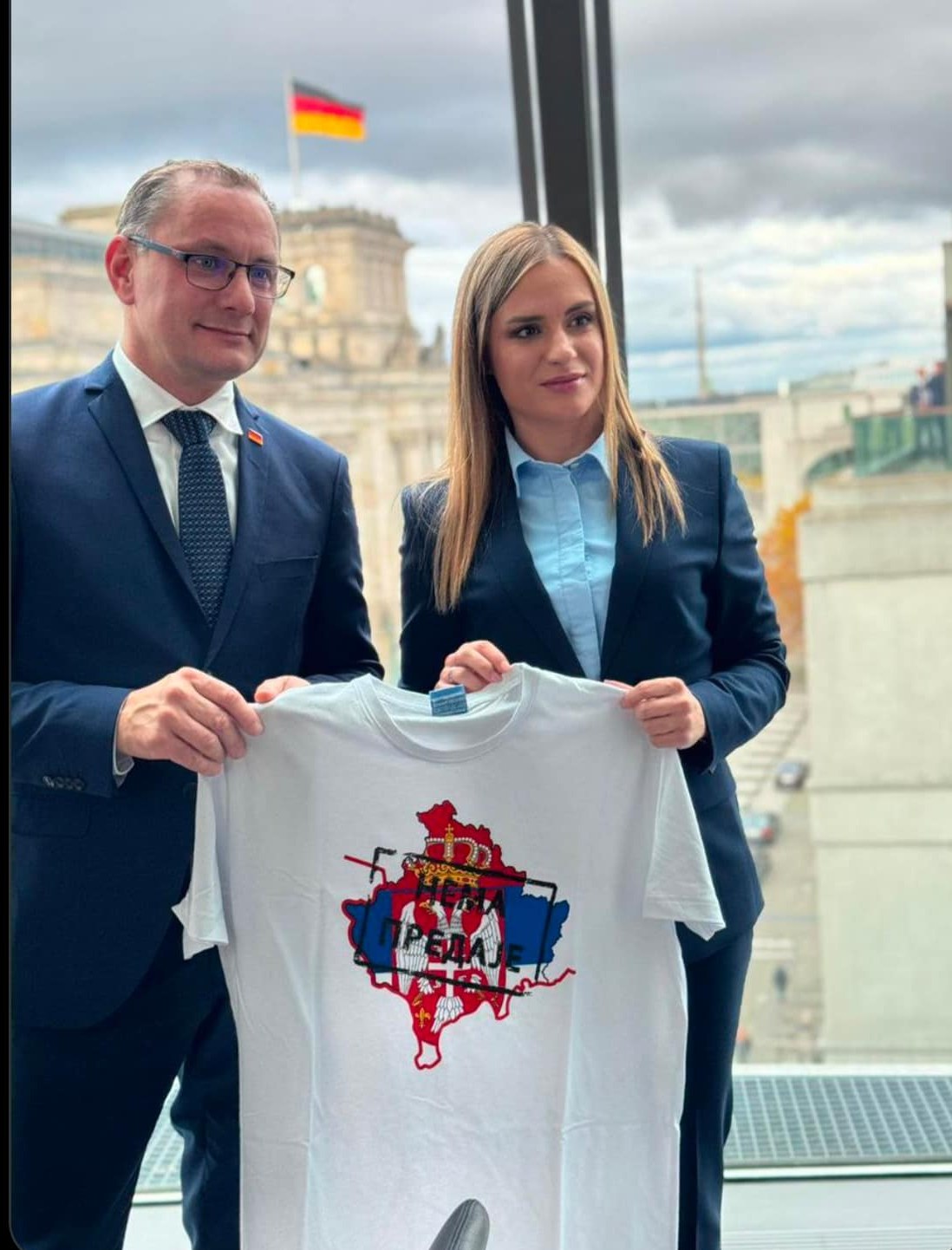 Ajo është pritur në Bundestag nga Chrupalla. Vetë ministrja serbe ka publikuar edhe një foto, ku shihet së bashku me Chrupallën duke mbajtur një hartë të Kosovës me mbishkrimin serb “nuk ka dorëzim”!