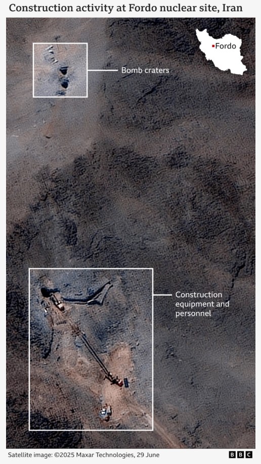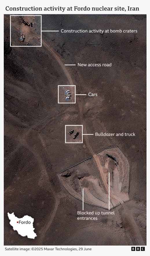 Sipas ekspertit të armëve bërthamore David Albright, i cili analizoi imazhet e të njëjtit vend të marra më 28 qershor, punimet e ndërtimit mund të përfshijnë mbushjen e kratereve, kryerjen e vlerësimeve të dëmeve inxhinierike dhe marrjen e mostrave radiologjike.