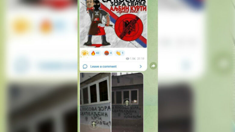Grafiti i shkruar në gjuhën serbe në shkrimin cirilic në shqip thotë “Me agimin që po lind në Kosovë, Albin Kurti do të jetë i vdekur”.