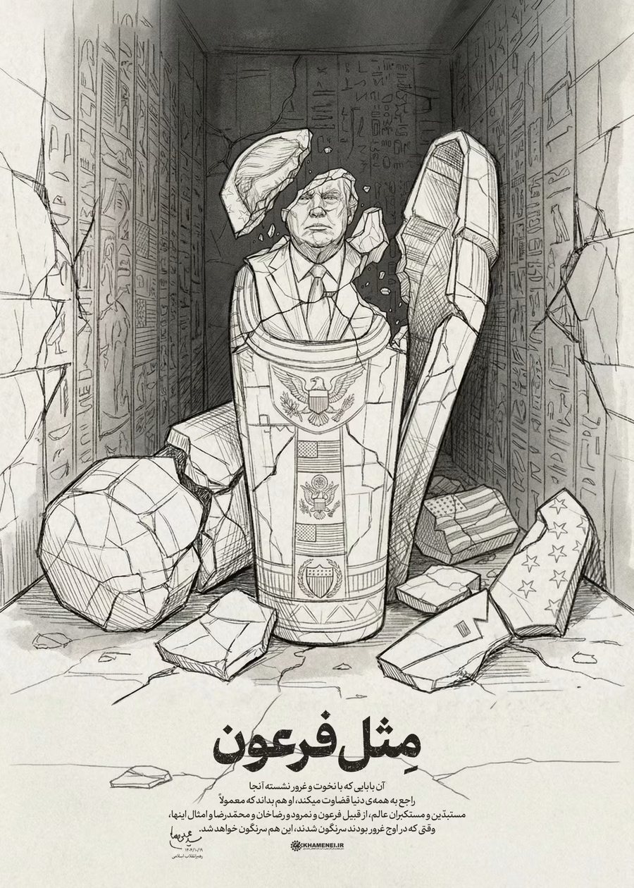 Llogaria zyrtare në rrjetet sociale e udhëheqësit Suprem të Iranit, Ajatollah Ali Khamenei, ka postuar një karikaturë në X, ku e përshkruan presidentin e SHBA-së Donald Trump si një sarkofag që po shembet, me një mesazh që thotë “edhe ky do të përmbyset”.