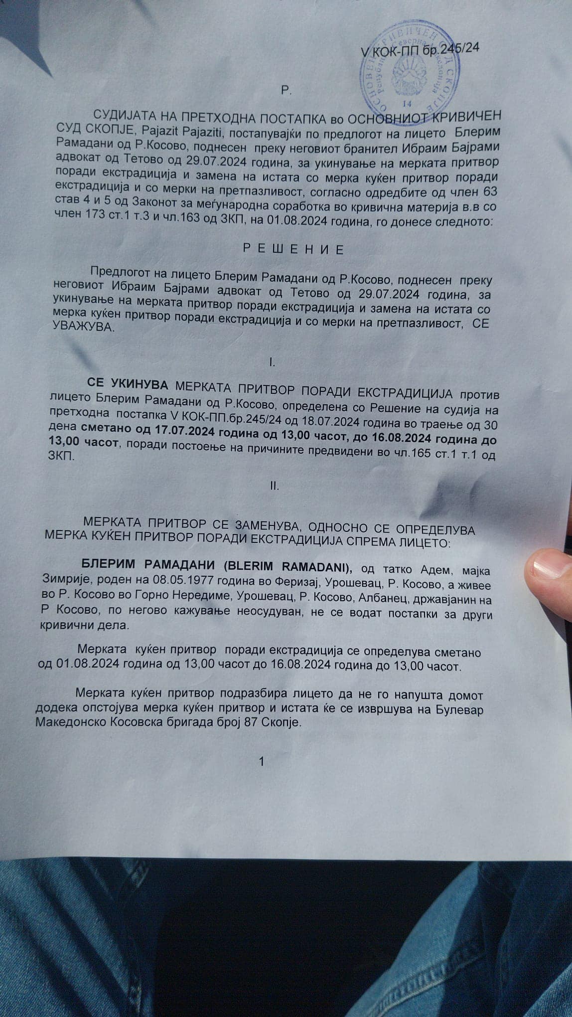 Sipas dokumentit Ramadani deri në kryerjen e procedurave të mëtejshme nga 01.08.2024 deri më 16..08.2024 do të ketë vendqëndrim të përkohshëm në Shkup.