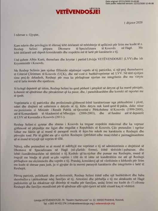 Për lirimin e Rexhep Selimit, letër në Gjykatën Speciale kishte dërguar edhe kreu i Vetëvendosjes, Albin Kurti, për të cilën kishte raportuar lajmi.net.