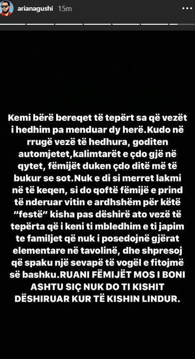 “Kemi bërë bereqet të tepërt sa që vezët i hedhim pa menduar dy herë. Kudo në rrugë vezë të hedhura, goditen automjetet, kalimtarët e çdo fjë në qytet, fëmijët duken çdo ditë më të bukur se sot. Nuk e di si merret lakmi në të keqen, si do qoftë fëmijë e prind të nderuar vitin e ardhshëm për këtë “festë” kisha pas dëshirë ato vezë të tepërta që i keni ti mbledhim e ti japim te familjes që nuk i posedojnë gjërat elementare në tavolinë, dhe shpresoj që spaku një sevapë të vogël e fitojmë së bashku. RUANI FËMIJËT MOS I BONI ASHTU SIÇ NUK DO TI KISHIT DËSHIRUAR KUR TË KISHIN LINDUR”, ka shkruar ai. /Lajmi.net/