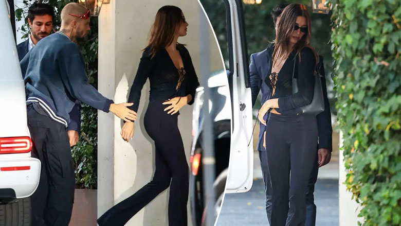 Ajo kishte bërë grim minimal dhe mbante veshur pantallona të zeza të ngushta dhe një bluzë me dantella me lidhëse përpara. Pas darkës, Hailey u fotografua duke mbajtur një shishe verë.