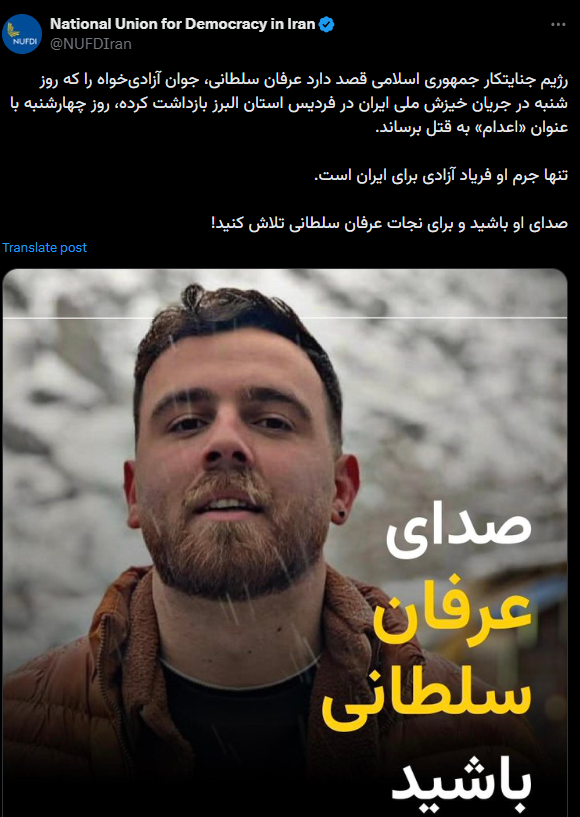 Ndërkaq, një organizatë tjetër, Unioni Kombëtar për Demokraci në Iran, shkruan krimi i Soltanit është lufta për lirinë e Iranit.