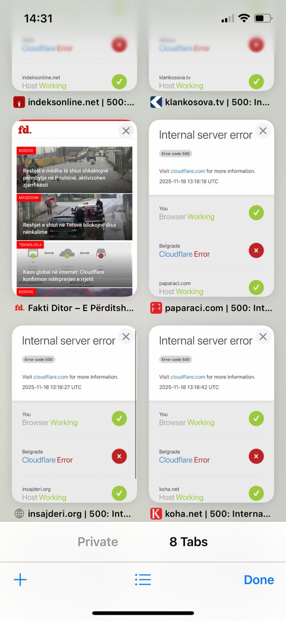 Pjesa më e madhe e mediave online në Kosovë janë jashtë funksionit. Duket se një problem me serverët e tyre jashtë vendit ka bërë që shumë portale të jenë offline. Faktiditor mëson se disa prej këtyre mediave u hostohen në serverë jashtë Kosovës (p.sh. në Gjermani, sipas dyshimeve fillestare), dhe pikërisht aty mund të jetë burimi i problemit.