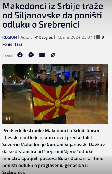 Kryetari i partisë “Maqedonasit në Serbi”, Goran Ilijevski, i ka dërguar letër Presidentes së re, Gordana Siljanovska Davkova, sic thuhet, të distancohet nga “veprimi i pamatur” i Ministrit të Jashtëm, Bujar Osmani dhe ta shfuqizojë vendimin për shpalljen e gjenocidit në Srebrenicë.