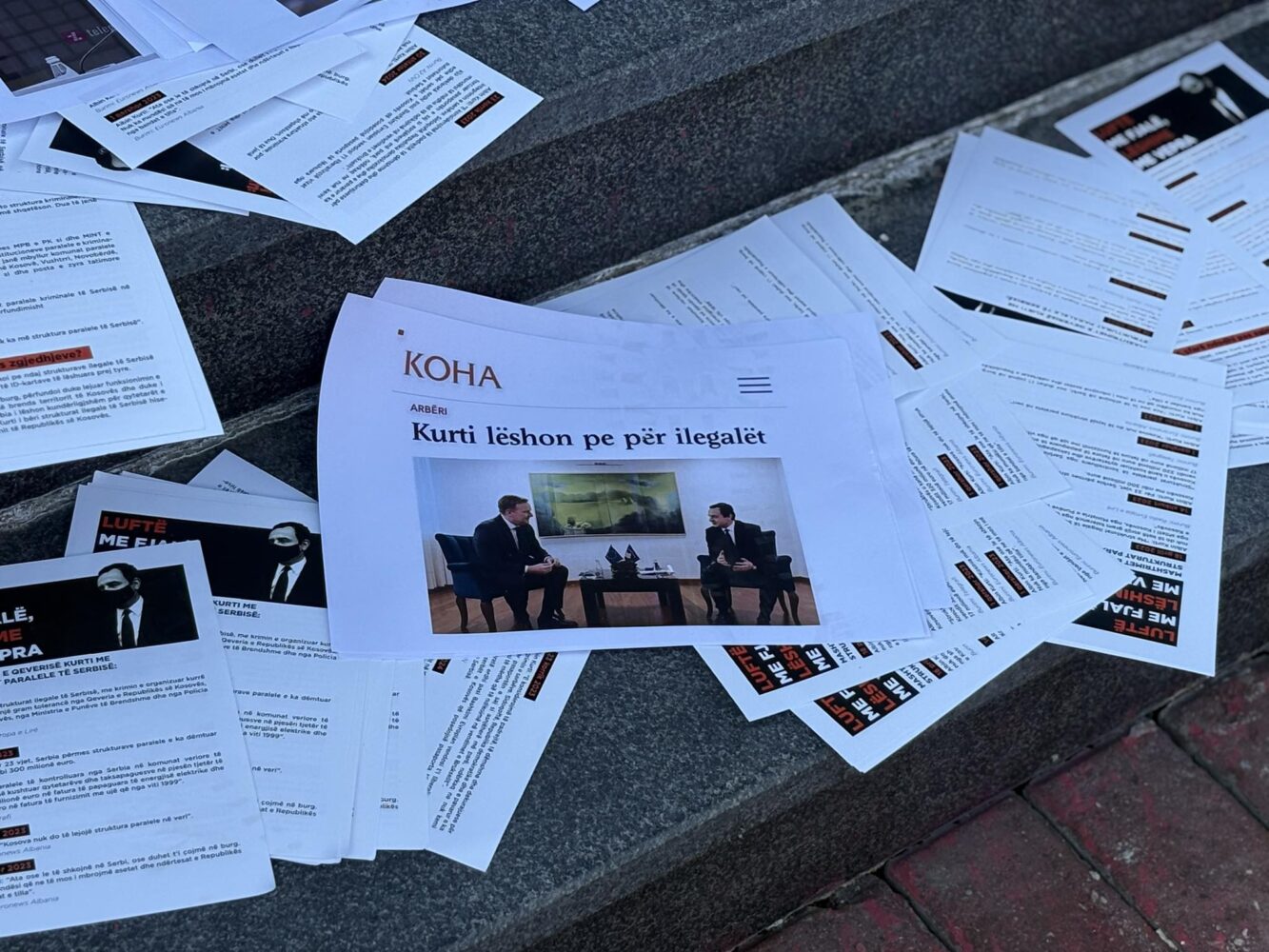 Rinia Demokratike e Kosovës ka mbajtur një aksion para Qeverisë së Kosovës, ku te shkallët e hyrjes së këtij objekti ka hedhur letra me mbishkrime sikur “mashtrimet e Kurtit”, si dhe “Kurti nuk lëshon pe për ilegalët”.
