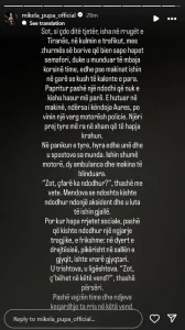 Në një postim të gjatë në rrjete sociale, Mikela tregoi se ndodhej në trafik në momentin kur pa kalimin e autokolonës policore dhe ambulancave që po shkonin drejt vendngjarjes.