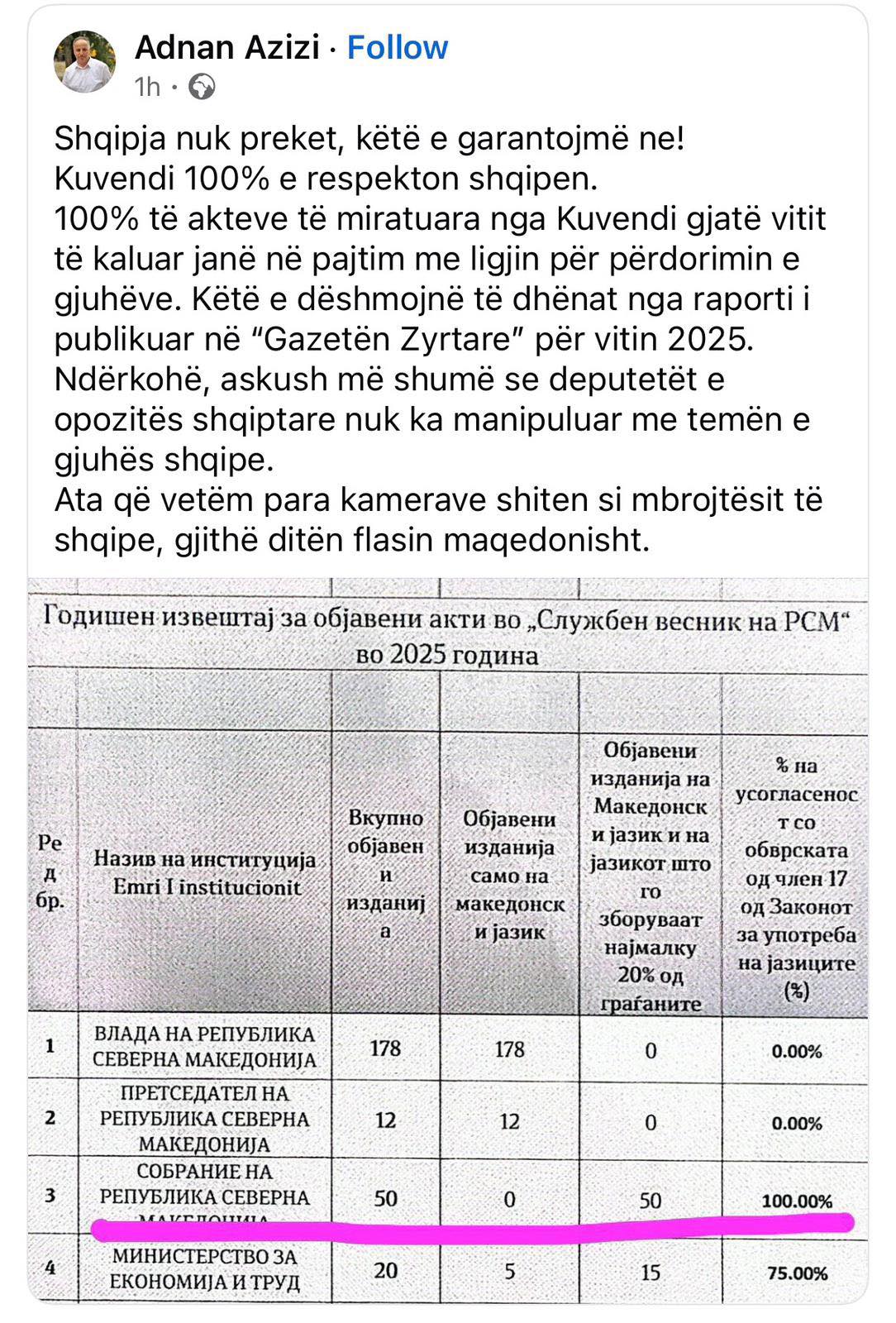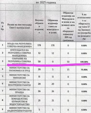 Akuzat shkojnë edhe më tej, duke theksuar se institucionet kryesore të shtetit, përfshirë Presidencën dhe Qeverinë, sipas të dhënave të përmendura, nuk e zbatojnë fare gjuhën shqipe, me një nivel implementimi që pretendohet të jetë zero për qind.