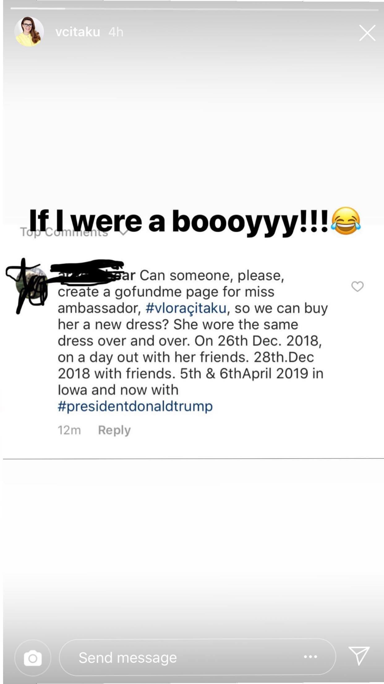 Një komentues i shkruan “A mundet dikush të krijojë një fondacion për ambasadoren Vlora Çitaku, kështu ne mund t’i blejmë asaj një fustan të ri. Ajo ka veshur të njëjtin fustan pa pushim. Më 26 dhjetor 2018, në një ditë me shoqërinë e saj. 28 dhjetor 2018 me miqtë. 5 dhe 6 prill 2019 në Lowa dhe tani me Donald Trump”.