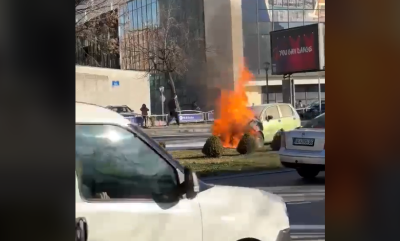 Një makinë përfshihet nga flakët në qendër të Shkupit, afër zyrave të Bashkimit Evropian
