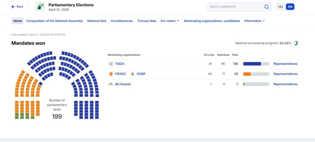 Janë numëruar 53.45 për qind të votave, ndërsa partia Tisza e Peter Magyarit po parashihet të marrë 136 ulëse në Parlamentin e Hungarisë, që do të jetë 2/3 e nevojshme. Fideszi i Viktor Orbanit do të marrë 56 ulëse, ndërsa Mi Hazank 7 ulëse.