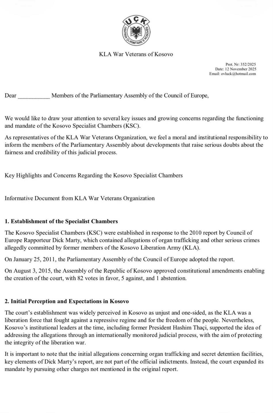 Organizata e Veteranëve të UÇK-së, ka dorëzuar 285 letra në emër të secilit anëtar të Asamblesë së Këshillit të Evropës, lidhur me shqetësimet që ata i shprehin për procesin e gjyqit ndaj ish-krerëve të Ushtrisë Çlirimtare të Kosovës në Gjykatën Speciale.
