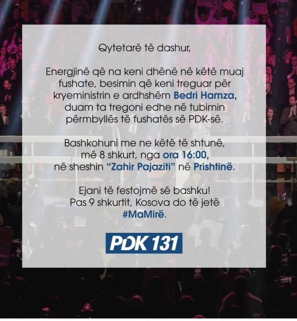 Në këtë tubim të pranishëm do të jenë kandidatët për deputet nga kjo parti si edhe kandidati i PDK-së për kryeministër, Bedri Hamza.