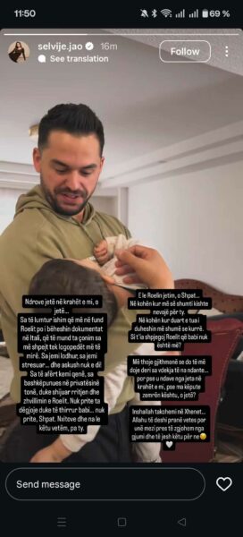 Top Lajm Postim prekës i gruas së Shpat Kasapit: Ndërrove jetë në krahët e mi o jetë, si t’ia shpjegoj Roelit që babi nuk është më? Nga Admin7 Me Nov 26, 2025 704 Ndaj FacebookTwitterGoogle+Email Për vdekjen e Shpat Kasapit ka reaguar pak më parë edhe gruaja e tij, Selvija. Në një story në Instagram, Selvija ka thënë se Shpat Kasapi ka ndërruar jetë në krahët e saj.