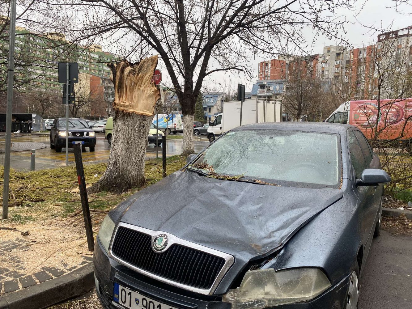 Në lagjen Dardania të Prishtinës, përkatësisht në rrugën “Ilaz Kodra”, disa vetura janë dëmtuar si pasojë e rrëzimit të një lisi nga erërat e forta.