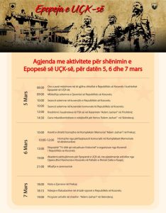 Ministria e Mbrojtjes e Republikës së Kosovës ka publikaur agjendën e aktiviteteve për shënimin e Epopesë së UÇK-së, që do të zhvillohen më 5, 6 dhe 7 mars në disa qytete të vendit.