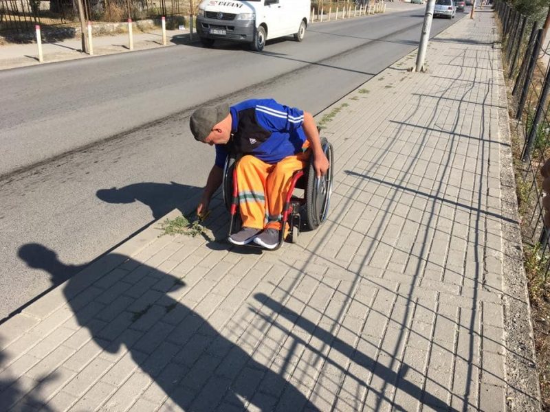 Me disa gërshërë në dorë ai bën kilometra të tëra duke i larguar barishtet e panevojshme nga trotuaret e qytetit. Ai është punëtor i “Eko Higjienës”. Në këtë kompani punon qe katër vjet.