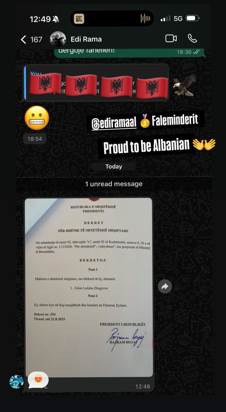 Një foto e publikuar nga lojtari i përfaqësueses së Kosovës në profilin e tij zyrtar në Instagram shfaq atë se duket të jetë ndihma e kryeministrit shqiptar, për t’i dhënë nënshtetësinë shqiptare lojtarit kosovar, në mënyrë që kalimi te Juventus të mund të kryhet, pas një ngërçi të hasur në javët e fundit në tratativat me Lille, ku Zhegrova luan aktualisht.