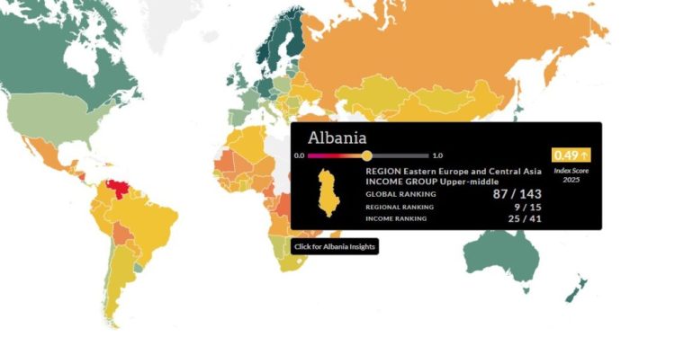Shkup, 28 tetor – Në renditjen e përgjithshme të Indeksit të Sundimit të Ligjit 2025 (World Justice Project), Shqipëria renditet në vendin e 87 nga 143 vende, duke u ngjitur me dy pozicione krahasuar me vitin e kaluar, kur mbante vendin e 89.