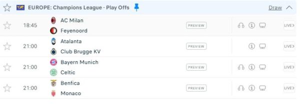 Vëmendja do të jetë në “San Siro”, ku Milani do të tentojë të kthejë rezultatin e ndeshjes së parë, ku të cilët humbën nga Feyenoordi me rezultat minimal 1-0, ndërsa Bayerni, pret në “Allianz Arena” skuadrën e Celticut, ku do të synojë të mbajë avantazhin e ndeshjes së parë.