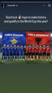 Këngëtarja me famë botërore, Rita Ora, ka shprehur mbështetjen e saj për përfaqësueset e Kosovës dhe Shqipërisë në futboll, përmes një postimi në rrjetet sociale.