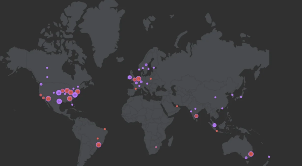 Harta tregon një numër veçanërisht të lartë të ndërprerjeve të raportuara në Evropë, Shtetet e Bashkuara dhe Australi.