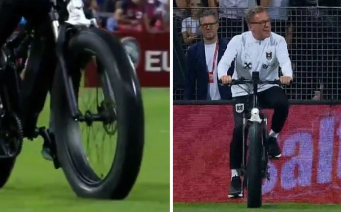 Trajneri austriak, Ralf Rangnick u paraqit në fushë me biçikeltë.