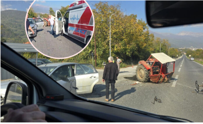 Nga pamjet e siguruara, shihet se si një traktor është ndarë përgjysmë pasi i njëjti është përplasur me një veturë.