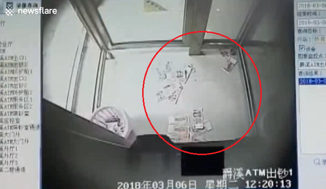 Pamjet e CCTV treguan se një tufë e kartëmonedhave papritmas binte në dyshemenë e një kabinë të ATM në Ningbo City, Kinë më 6 mars.