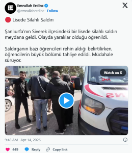 Një sulm me armë zjarri u regjistrua këtë të marte në një shkollë të mesme në Siverek të Turqisë. 16 persona përfshirë nxënës u plagosën në sulm. Guvernatori i Sanlıurfas, Hasan Sıldak, njoftoi se sulmuesi i kishte marrë jetën vetes.