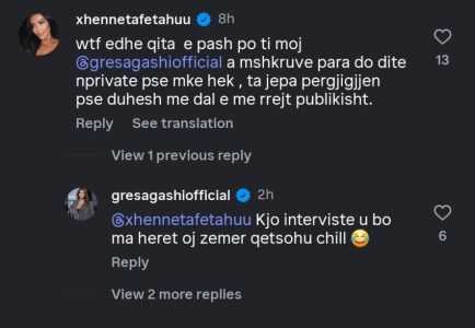 “Wtf edhe qita e pash po ti moj Gresa, a m’shkruve para do dite n’private pse m’ke hek, ta jepa përgjigjen pse duhesh me dalë e me rrejt publikisht”, ka shkruar ajo hapur në komente.