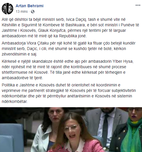 “Atë që dështoi ta bëjë ministri serb, Ivica Daçiq, tash e shumë vite në Këshillin e Sigurimit të Kombeve të Bashkuara, e bëri sot ministri i Punëve të Jashtme i Kosovës, Glauk Konjufca, përmes një tentimi për të larguar ambasadoren më të mirë që ka Republika jonë”, ka shkruar Beharmi.